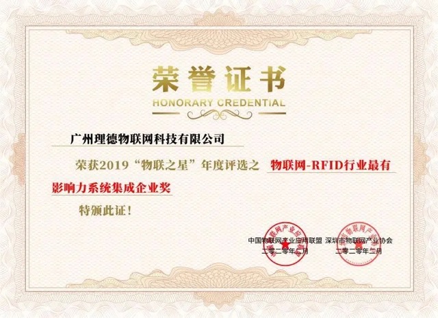 由中國物聯網產業應用聯盟和深圳市物聯網產業協會發起的2019“物聯之星”年度評選獎項揭曉,廣州理德物聯網科技有限公司(思創理德)榮獲2019“物聯之星”年度評選之物聯網-RFID行業最有影響力系統集成企業獎。