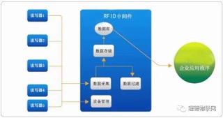 RFID 中間件扮演RFID標簽和應用程序之間的中介角色,從應用程序端使用 中間 件所提供一組通用的應用程序接口(API),即能連到RFID讀寫器,讀取RFID標簽數據。這樣一來,即使存儲RFID標簽情報的數據庫軟件或后端應用程序增加或改由其他軟件取代,或者讀寫RFID讀寫器種類增加等情況發生時,應用端不需修改也能處理,省去多對多連接的維護復雜性問題。